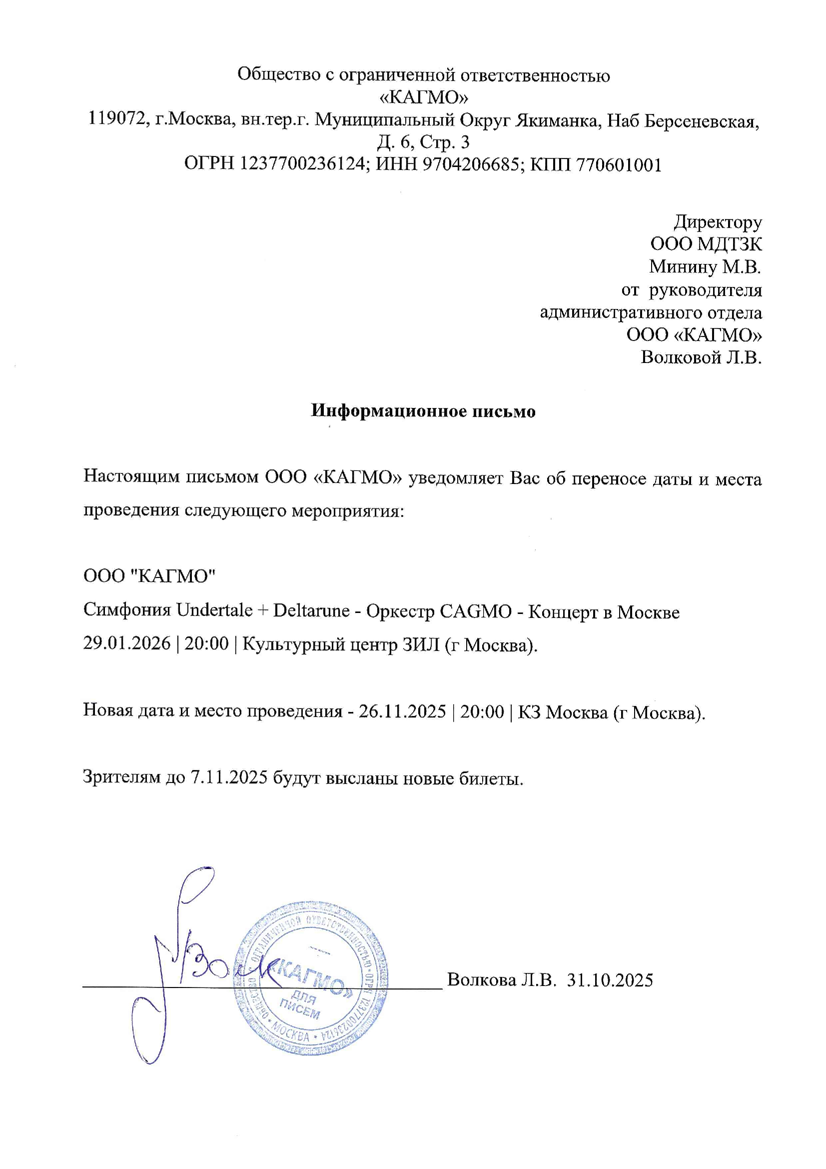 Уважаемый клиент! Спешим сообщить, что по информации, полученной от организатора, концерт «Симфония Undertale + Deltarune в Москве – Оркестр CAGMO», запланированный на 29 января 2026 года в 20:00 в Культурном центре «ЗИЛ», перенесен на 26 ноября 2025 года, начало в 20:00. Также изменено место проведения. Новое место проведения концерта - Концертный зал «Москва» (г. Москва, Проспект Андропова, дом 1). Ранее приобретенные билеты подлежат обмену на новую площадку. В ближайшее время вам будут направлены новые билеты. По всем дополнительным вопросам обращайтесь, пожалуйста, в службу поддержки CAGMO: https://help.cagmo.ru/ С уважением, команда поддержки Ticketland.