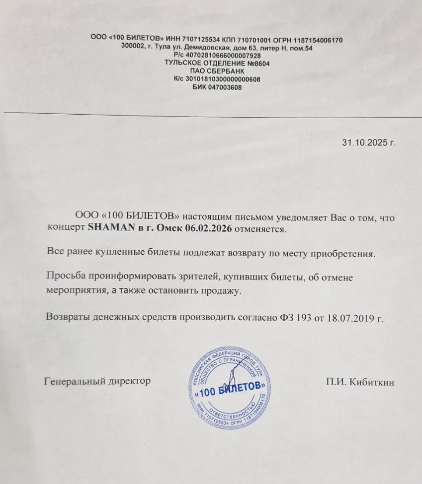 Уважаемый клиент! Спешим сообщить, что по информации, полученной от организатора, Концерт SHAMAN, запланированный на 6 февраля 2026 года в 19:00 в G-Drive Арене, отменён. Деньги за электронные билеты вернутся автоматически в полном объёме на карту, с которой была произведена оплата. Если вы купили билет в кассе Ticketland.ru за наличный расчет, то обратитесь, пожалуйста, на почту: vozvrat@ticketland.ru. С уважением, команда поддержки Ticketland.