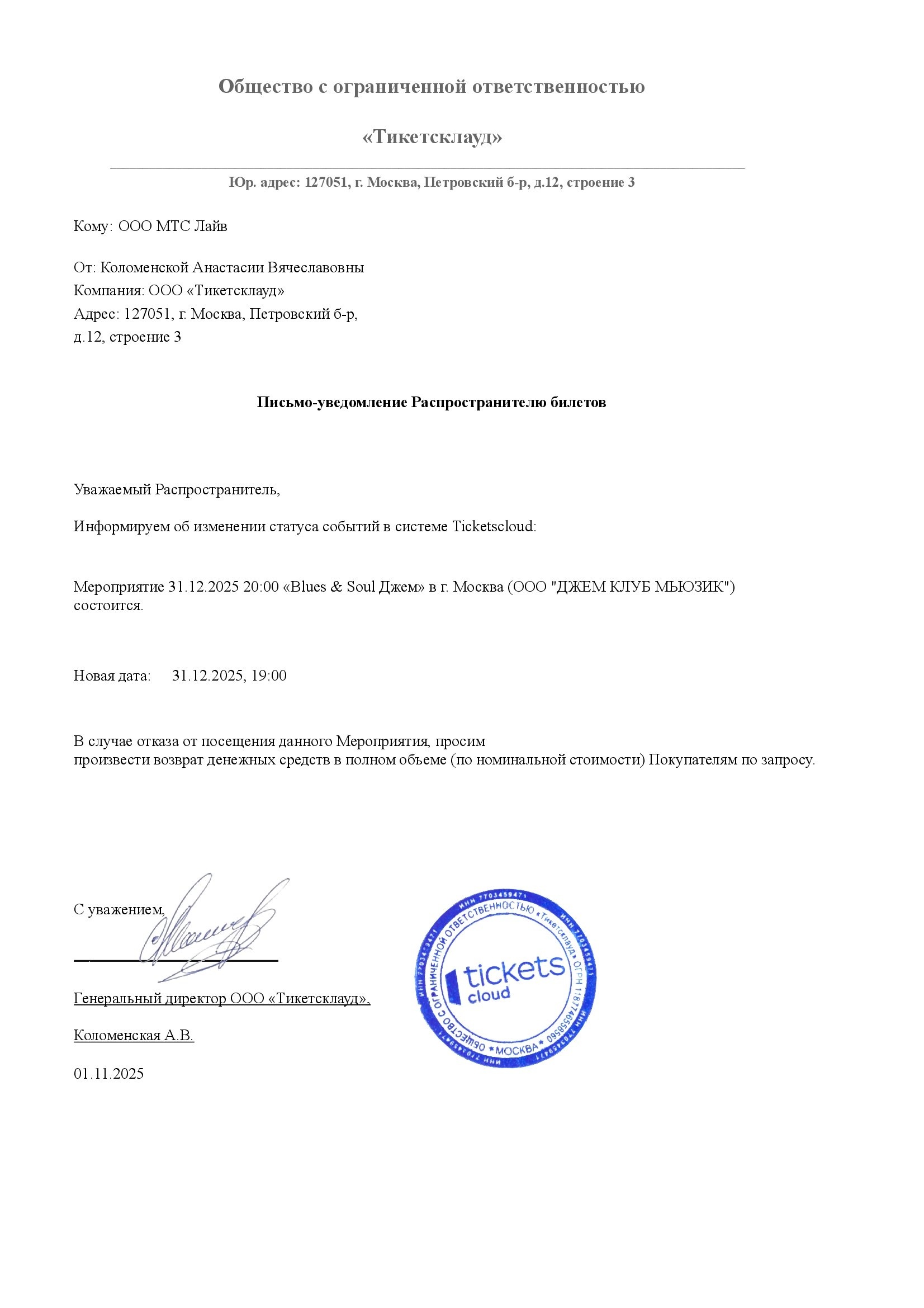 Уважаемый клиент! Спешим сообщить, что по информации, полученной от организатора, концерт «Blues & Soul Джем», запланированный на 31 декабря 2025 года в 20:00 в Jam club, перенесён на 19:00 Ранее приобретенные билеты действительны на новое время, обменивать их не нужно. Если вам не удобно посетить концерт в новое время, вы можете вернуть билет по кнопке в личном кабинете во вкладке «Заказы». Деньги за электронные билеты вернутся автоматически в полном объёме на карту, с которой была произведена оплата. Если вы купили билет в кассе Ticketland.ru за наличный расчет, то обратитесь, пожалуйста, на почту: vozvrat@ticketland.ru. С уважением, команда поддержки Ticketland.