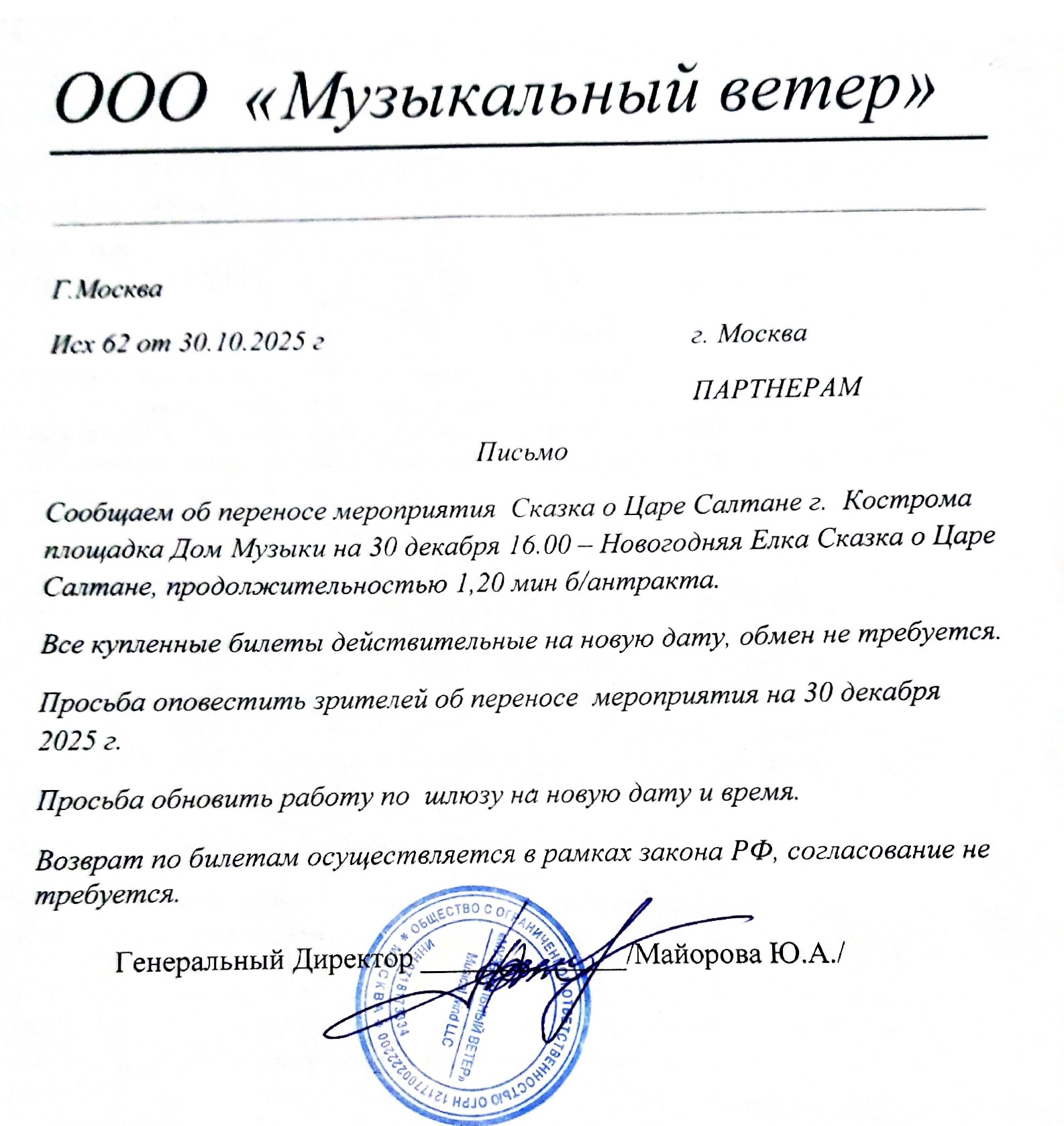 Уважаемый клиент! Спешим сообщить, что по информации, полученной от организатора, спектакль «Сказка о Царе Салтане», запланированный на 31 октября 2025 года в 17:00 в Доме музыки Павла Герштейна, перенесён на 30 декабря 2025 года, начало в 16:00. Ранее приобретенные билеты действительны на новую дату, обменивать их не нужно. Если вам не удобно посетить спектакль в новую дату, вы можете вернуть билет по кнопке в личном кабинете во вкладке «Заказы». Деньги за электронные билеты вернутся автоматически в полном объёме на карту, с которой была произведена оплата. Если вы купили билет в кассе Ticketland.ru за наличный расчет, то обратитесь, пожалуйста, на почту: vozvrat@ticketland.ru. С уважением, команда поддержки Ticketland.
