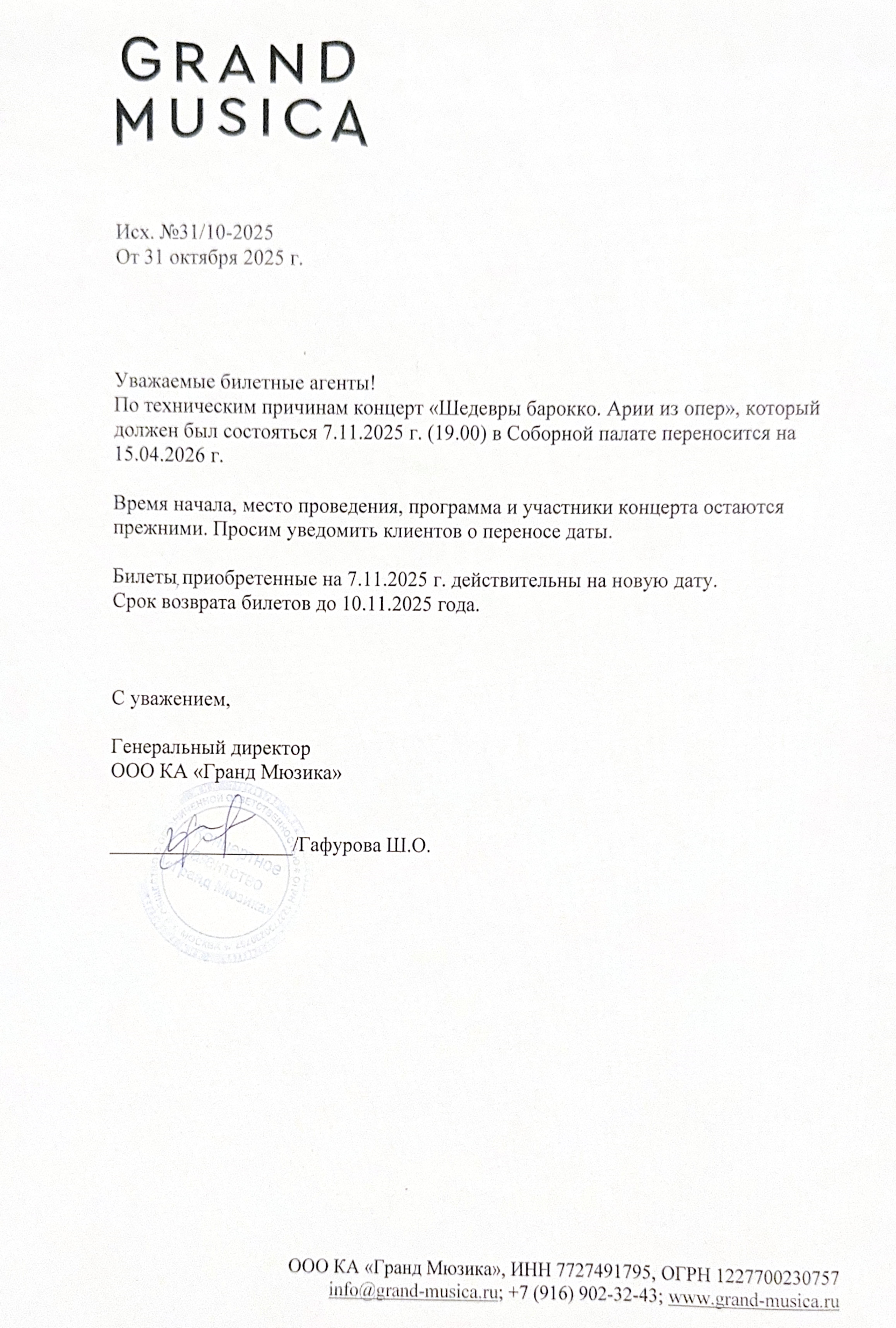Уважаемый клиент! Спешим сообщить, что по информации, полученной от организатора, концерт «Шедевры барокко. Арии из опер», запланированный на 7 ноября 2025 года в 19:00 в Соборной палате ПСТГУ, перенесён на 15 апреля 2026 года, начало в 19:00. Ранее приобретенные билеты действительны на новую дату, обменивать их не нужно. Если вам не удобно посетить концерт в новую дату, вы можете вернуть билет по кнопке в личном кабинете во вкладке «Заказы» (до 10 ноября 2025 года включительно). Деньги за электронные билеты вернутся автоматически в полном объёме на карту, с которой была произведена оплата. Если вы купили билет в кассе Ticketland.ru за наличный расчет, то обратитесь, пожалуйста, на почту: vozvrat@ticketland.ru. С уважением, команда поддержки Ticketland.