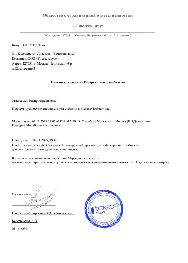 Уважаемый клиент! Спешим сообщить, что по информации, полученной от организатора, концерт Liza Madrid, запланированный на 2 ноября 2025 года в 19:00 в клубе «Anima», перенесен в клуб «Свобода». Ранее приобретенные билеты действительны на новую дату, обменивать их не нужно. Если вам не удобно посетить мероприятие в новую дату, вы можете вернуть билет по кнопке в личном кабинете во вкладке «Заказы». Деньги за электронные билеты вернутся автоматически в полном объёме на карту, с которой была произведена оплата. Если вы купили билет в кассе Ticketland.ru за наличный расчет, то обратитесь, пожалуйста, на почту: vozvrat@ticketland.ru. С уважением, команда поддержки Ticketland