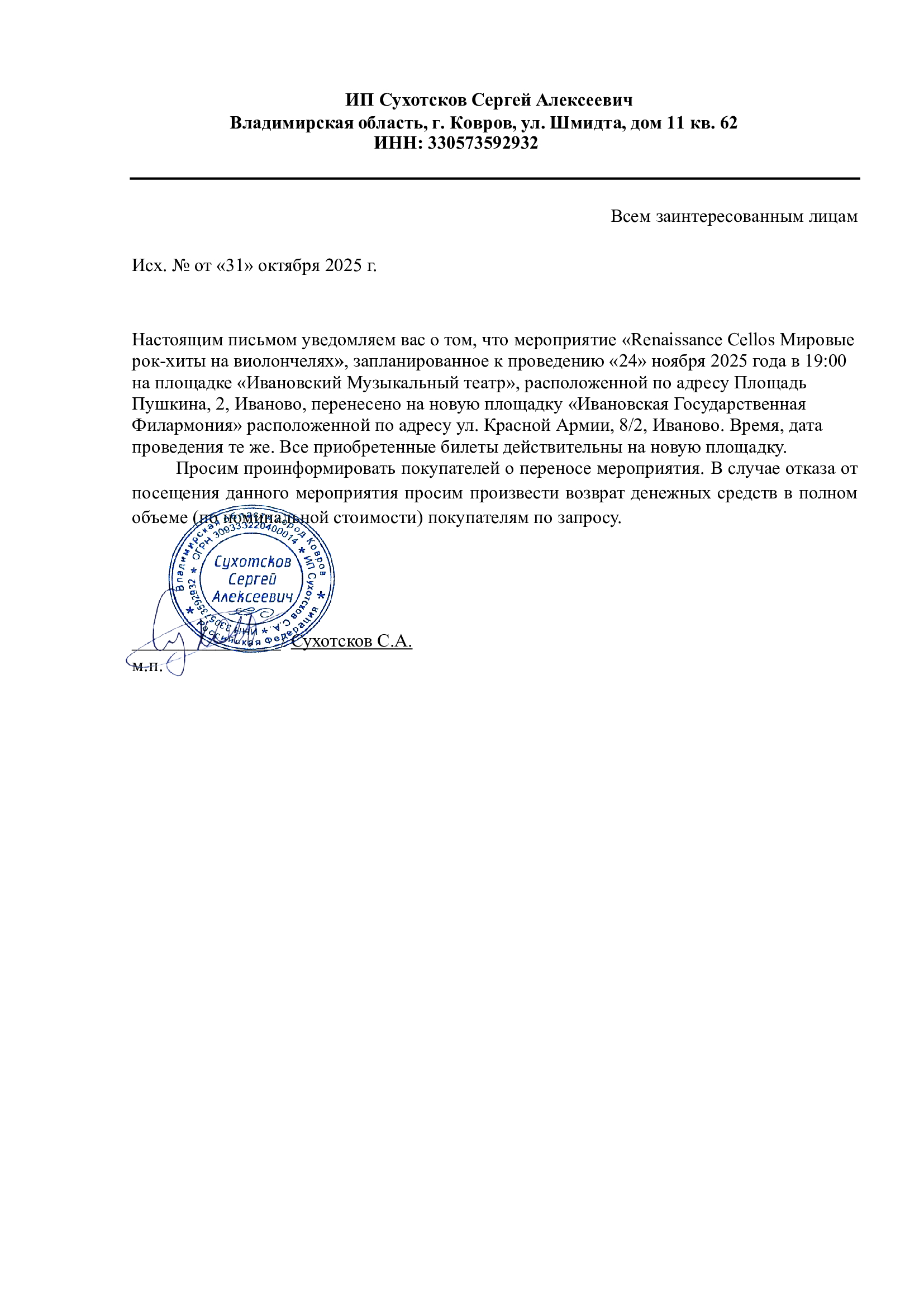 Уважаемый клиент! Актуальная информация. Спешим сообщить, что по информации, полученной от организатора, у концерта «Renaissance Cellos. Мировые рок-хиты на виолончелях», запланированного на 24 ноября 2025 года в 19:00 в Ивановском музыкальном театре, изменено место проведения. Новое место проведения концерта - Ивановская государственная филармония (г. Иваново, ул. Красной Армии, 8/2). Ранее приобретенные билеты подлежат обмену на новую площадку. За новым билетами в Ивановскую государственную филармонию обращайтесь, пожалуйста, к организатору концерта по электронной почте: ticket@profkassa.com. Если вам не удобно посетить концерт на новой площадке, вы можете вернуть билет по кнопке в личном кабинете во вкладке «Заказы» (до 11 ноября 2025 года включительно). Деньги за электронные билеты вернутся автоматически в полном объёме на карту, с которой была произведена оплата. Если вы купили билет в кассе Ticketland.ru за наличный расчет, то обратитесь, пожалуйста, на почту: vozvrat@ticketland.ru. С уважением, команда поддержки Ticketland.