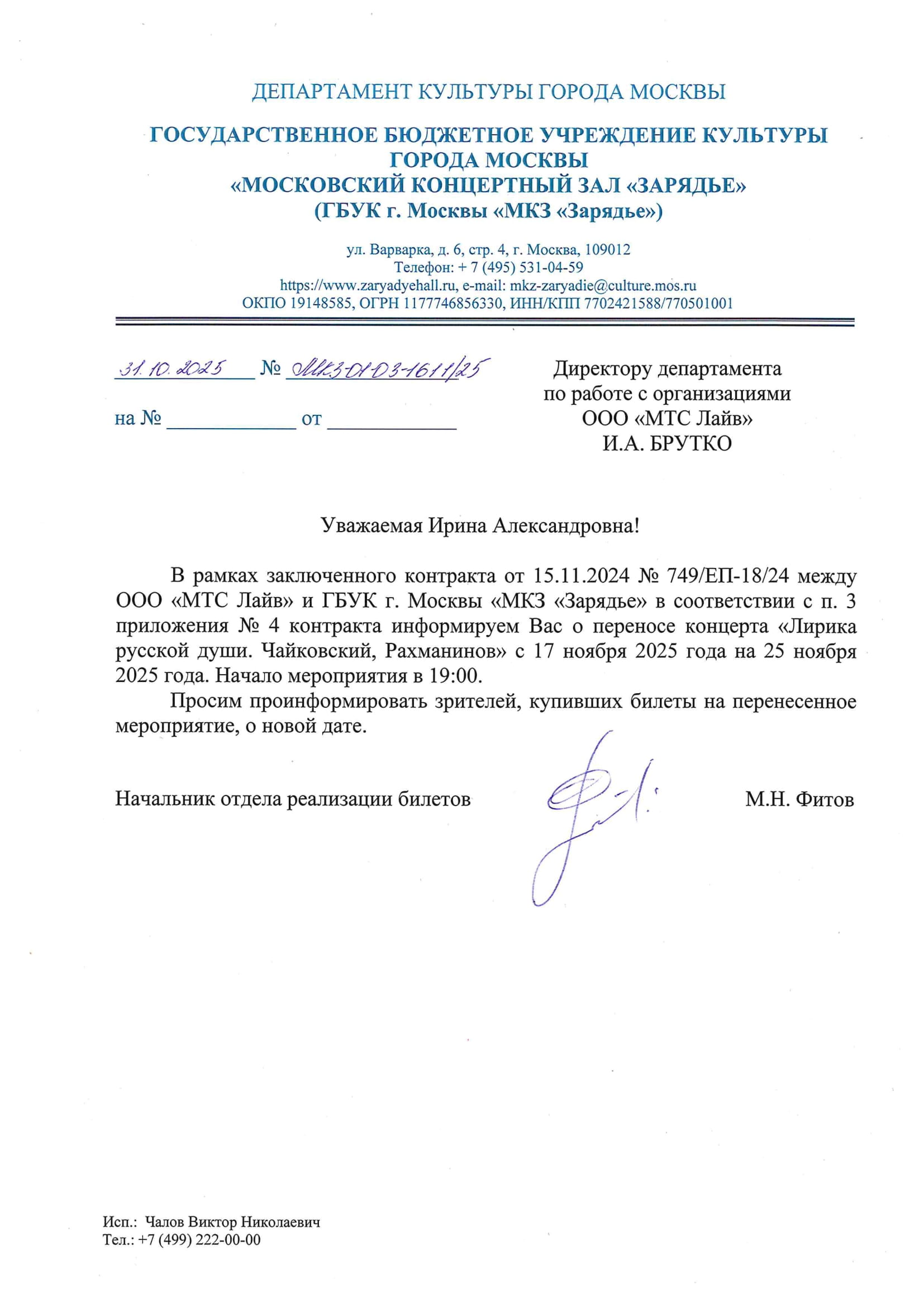 Уважаемый клиент! Спешим сообщить, что по информации, полученной от организатора, концерт «Лирика русской души. Чайковский, Рахманинов, Свиридов», запланированный на 17 ноября 2025 года в 19:00 в МКЗ «Зарядье», перенесён на 25 ноября 2025 года, начало в 19:00. Ранее приобретенные билеты действительны на новую дату, обменивать их не нужно. Если вам не удобно посетить концерт в новую дату, вы можете вернуть билет по кнопке в личном кабинете во вкладке «Заказы». Деньги за электронные билеты вернутся автоматически в полном объёме на карту, с которой была произведена оплата. Если вы купили билет в кассе Ticketland.ru за наличный расчет, то обратитесь, пожалуйста, на почту: vozvrat@ticketland.ru. С уважением, команда поддержки Ticketland.