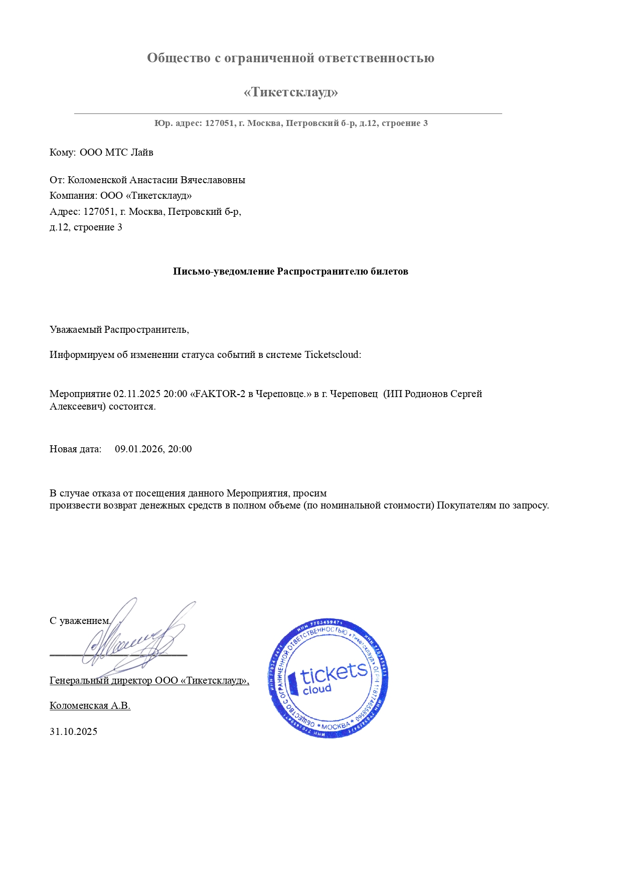 Уважаемый клиент! Спешим сообщить, что по информации, полученной от организатора, концерт группы «Faktor-2» запланированный на 2 ноября 2025 года в 20:00, в КЦ «Pivzavod» перенесён на 9 января 2026 года в 20:00. Ранее приобретенные билеты действительны на новую дату, обменивать их не нужно. Если вам не удобно посетить мероприятие в новую дату, вы можете вернуть билет по кнопке в личном кабинете во вкладке «Заказы». Деньги за электронные билеты вернутся автоматически в полном объёме на карту, с которой была произведена оплата. Если вы купили билет в кассе Ticketland.ru за наличный расчет, то обратитесь, пожалуйста, на почту: vozvrat@ticketland.ru. С уважением, команда поддержки Ticketland